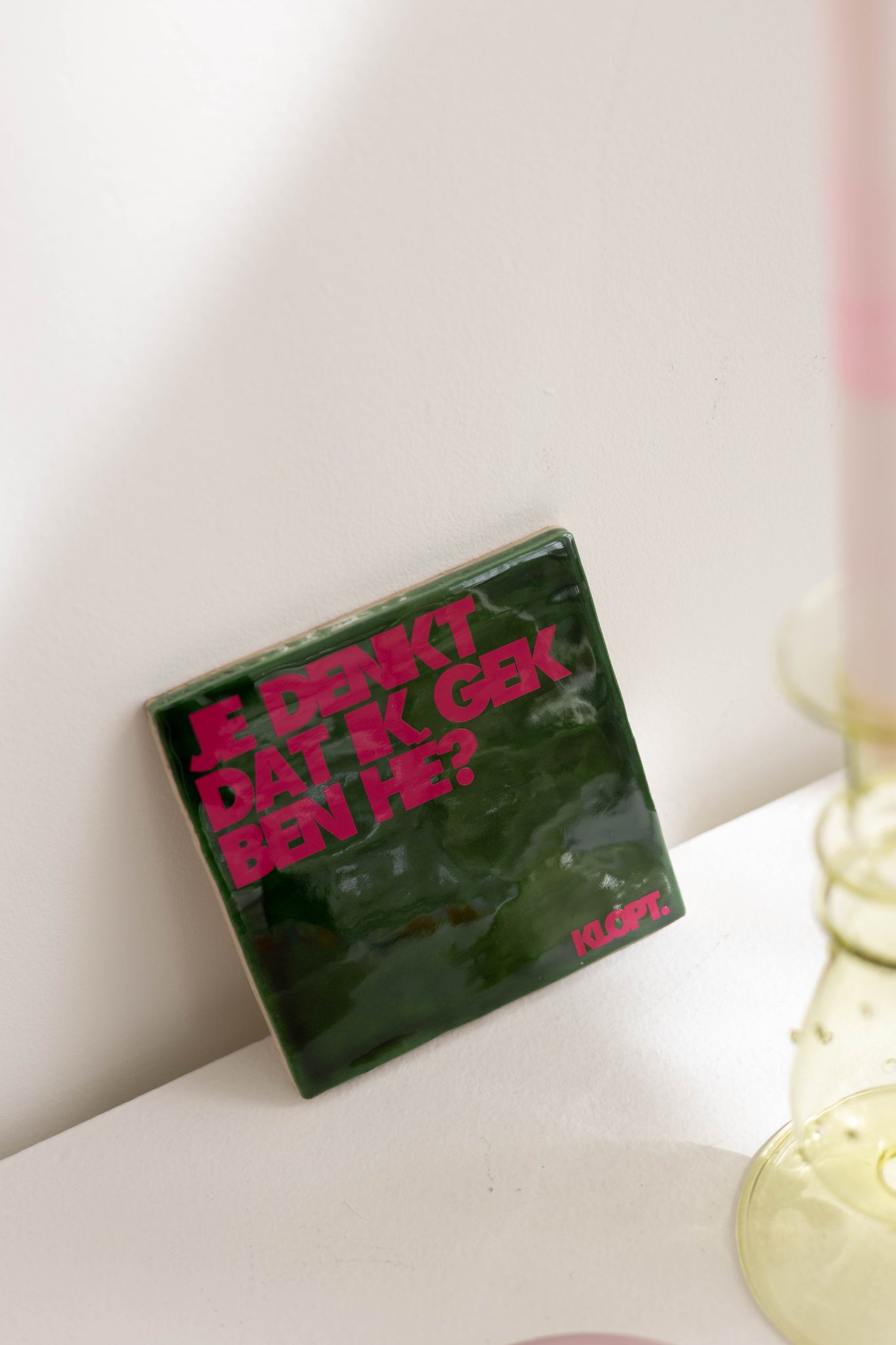 Wat ons betreft kun je het tegeltje echt overal neerzetten! Je kunt er daarnaast ook voor kiezen om het als muur accessoire te gebruiken en dus op te hangen. Daarom leveren we er los een plakhanger bij. Het lijmgedeelte kun je activeren door middel van water. Hierna moet je het ongeveer 24 uur laten drogen voordat je het kunt ophangen.